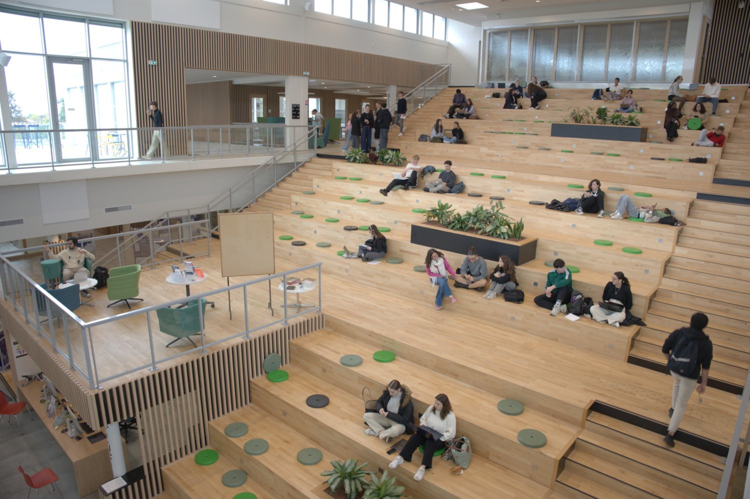 Le second espace doté de six écrans — dont deux grands pour la visioconférence — permet à plusieurs utilisateurs de partager simultanément leurs contenus, avec ou sans fil permettant les échanges en petit groupe, les réunions hybrides ou les ateliers de formation aux compétences transversales. L’objectif est d’encourager les pratiques actives et d’accompagner la réussite étudiante.