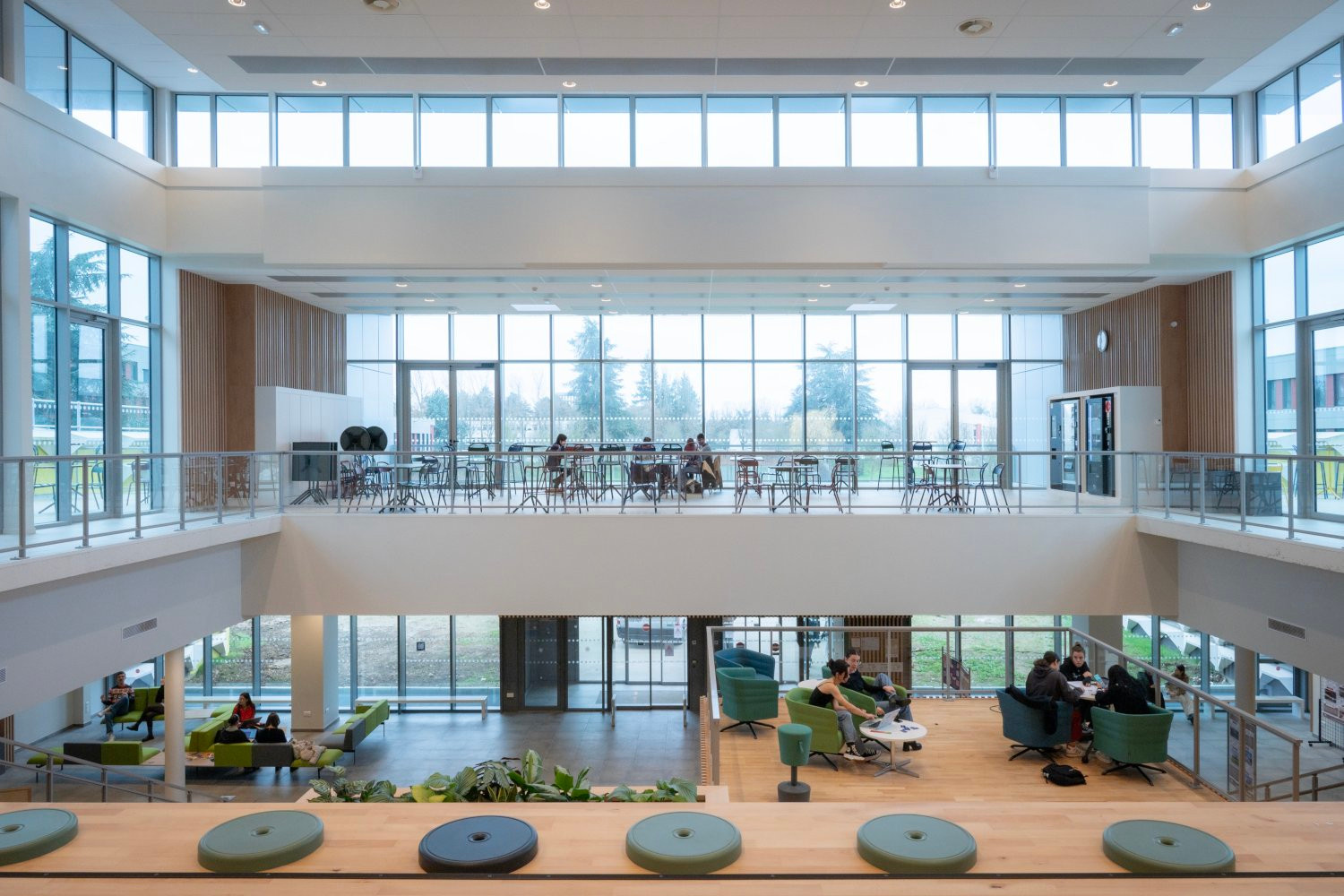 Imaginée comme un lieu multiforme et multiservice, la Ruche a été conçue dans une logique d’espaces au service des publics : le hall d’entrée s’ouvre sur un immense gradin desservant deux salles de lecture situées aux 1er et 2e étages, une cafétéria et trois terrasses. Ce gradin est un véritable lieu de vie où les pratiques diverses se croisent : certains étudiants y travaillent connectés au réseau Wifi, d’autres s’y donnent rendez-vous, font leurs pauses, mangent, discutent, se reposent. Au rez-de-chaussée, avant d’entrer dans les salles de lecture situées de part et d’autre du hall, des canapés invitent à la détente, le point presse et les distributeurs à quelques pas, et l’espace expositions permet de découvrir des collections ou des expositions proposées par le SCD ou l’Université. Des fauteuils et canapés viennent également compléter l’aménagement des salles de lecture. Ces mobiliers rythment les espaces et favorisent l’appropriation des lieux : les étudiants n’hésitent pas à y dormir ou travailler en chaussettes après avoir laissé leur déjeuner dans un casier vitré fermant à clé.