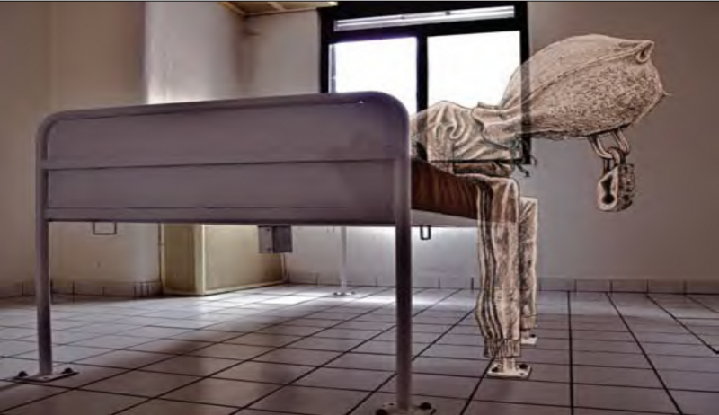 Oui, l’homme-cadenas par exemple, que j’ai dessiné au milieu d’une ancienne chambre d’apaisement dont l’ambiance m’a paru terrible avec, encore, des odeurs très fortes, ça transpirait le mal-être. J’ai remplacé les pieds du personnage par les pieds du lit vissés au sol, ce qui relève pour moi de l’ordre de l’immuable. Le personnage se transforme en mobilier d’hôpital.