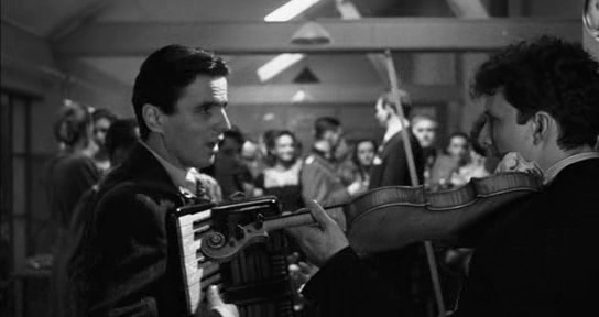 Afin de renforcer l’identité entre l’instrument et le personnage, Williams s’appuie sémiotiquement sur des référents culturels. L’harmonica des thèmes de Sugarland Express renvoie à la musique country et plus généralement à la campagne américaine que les personnages sillonnent ; la trompette de Né un 4 juillet évoque le contexte militaire et politique des États-Unis, dans l’héritage des œuvres patriotiques d’Aaron Copland9. Même si le modèle de Williams semble bien être les Zigeunerweisen pour violon et orchestre (1878) de Pablo de Sarasate, le violon de La Liste de Schindler peut être interprété comme une référence aux ensembles de musique klezmer, traditionnellement jouée par les Juifs ashkénazes. L’instrument, que l’on aperçoit diégétiquement dans le film à l’occasion d’une fête dans le baraquement de la direction du camp (figure 1), n’est pas, contrairement aux autres cas évoqués ici, affecté à un personnage en particulier mais se fait l’écho de la voix collective des Juifs polonais, Williams ayant cherché à refléter « les aspects les plus tendres et les plus nostalgiques de la vie juive en ces jours tourmentés10. » (Williams 1993, 2)