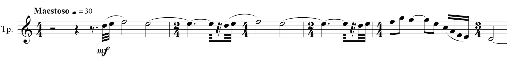 Dans Né un 4 juillet, Ron Kovic rejette progressivement la guerre du Vietnam jusqu’à devenir le porte-drapeau des pacifistes, contre sa famille et la majorité de l’opinion américaine. Le thème principal, que l’on entend dès le début du film, est associé au destin tragique du personnage. Né le jour de la fête nationale américaine, Ron s’engage parmi les Marines pour aller combattre au Vietnam. Il reviendra de la guerre, meurtri dans sa tête – il a tué à bout portant un de ses camarades – et dans sa chair – il est hémiplégique. Ce thème (thème 1, exemple 2), toujours confié à la trompette dans le film, consiste en une série d’élans brisés qui finissent par se stabiliser – après une descente d’une octave –, à l’image du destin de Ron. Il connaît un grand nombre d’occurrences mais nulle part le lien avec son signifié n’est aussi clair que lorsqu’on entend son incipit joué par bribes sur une texture dominée par l’atonalité (40:35) alors que la caméra adopte le point de vue subjectif de Ron, tête en bas, porté par un soldat.