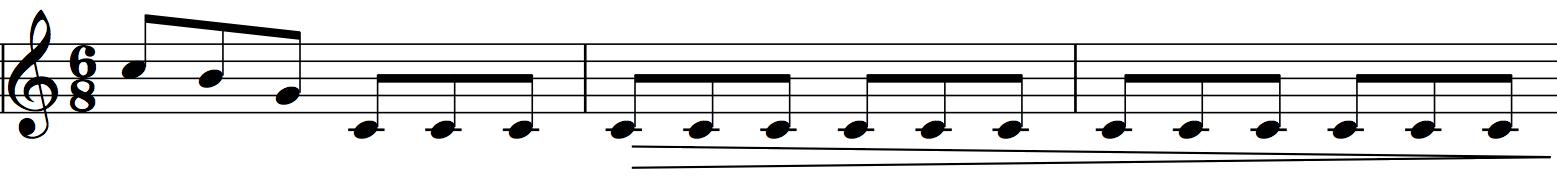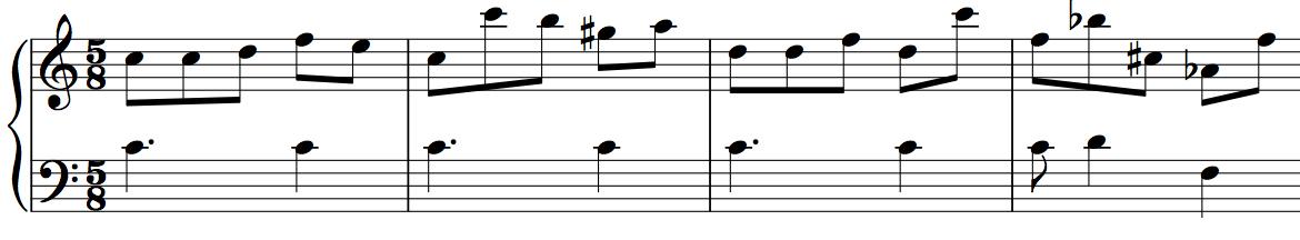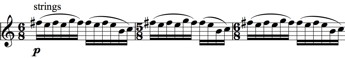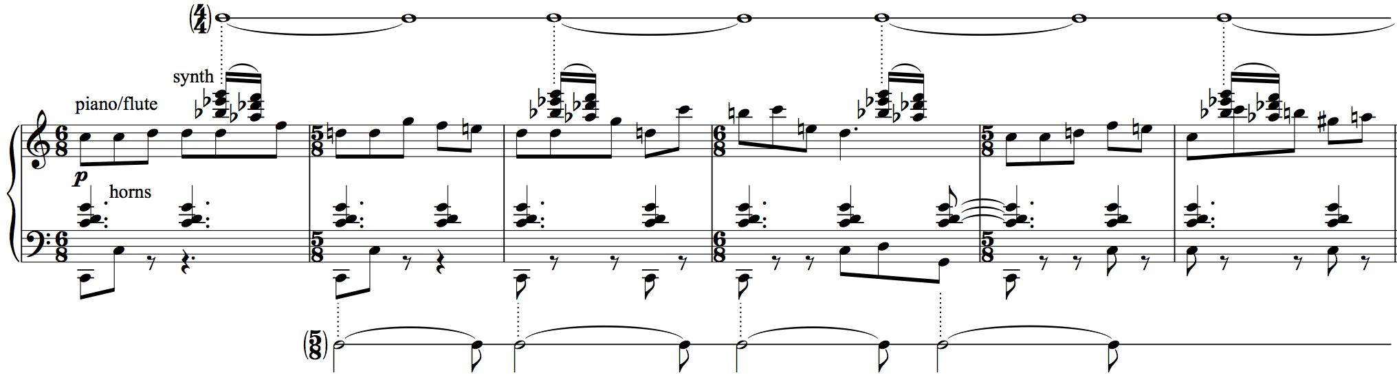 A notable interruption in the rhythm/meter/key occurs after Monica opens the closet door to let David out (17:34). The music starts with the ‘precursor’ to the “Bonding” theme but is soon interfered with by a recurring, two sixteenth note figure in electronics with almost no relation to the underlying music. Harmonically this figure, an E♭ triad to D♭ triad in quick succession, has no relation to C major. It also occurs in a register not occupied by any other voice. Finally, this figure, rhythmically speaking, operates on a separate Roederian pulse stream from the rest of the music (Figure 10) (Roeder 2004, 45). The 6/8 to 5/8 back and forth along with the unexpected accents (the melodic peaks and the horn attacks) give the music an unsteady pulse. However, the figure in electronics operates on a regular pulse stream that has no relation to meter or pulse of the rest of the music. All of these aspects draw a great deal of attention to this little figure, emphasizing that once again David’s artificiality is still on Monica’s mind.