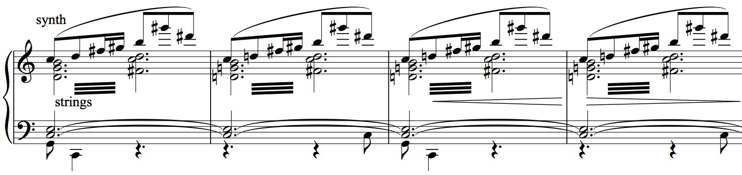 The music does not however leave Monica’s perspective for long. After four repetitions of the harp figure, the “Curiosity” theme is stated in a bell-like electronic sound with a tinny, artificial attack that contrasts greatly with the softer, warmer sustained notes of the surrounding acoustic instruments (Figure 2). The first two notes of the motive, C and D, coincide with the established C tonic. The next five notes, F♯, G♯, B, G♯ and D♯, break from that and suggest the key of E major, B major, or even A Lydian, creating what Royal Brown refers to as a “mildly unsettling bitonality” in his analysis of this scene (Brown 2001, 330). Underneath the repeating motive, the strings never waver from their Lydian infused C Major chord. Already two seemingly clashing ideas, a “standing one’s ground” tonic in C and an unrelated key with at least four accidentals, are simultaneously evident in the music. This might be David’s first major experience, as presented in the film, but Monica has not warmed to him and his presence is noticeably clashing with her sensibilities.
