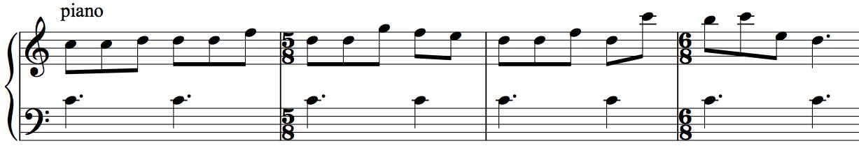 Even the music that often leads into the “Bonding” theme, acting as its “precursor,” has a mix of elements that similarly suggest Monica’s internal conflict. Played entirely on piano, it contains a simple, tonal melody that is firmly entrenched in C major, accompanied by a repeated middle C drone (Figure 3). While the melodic rhythm is comprised of only eighth notes, it dances between 6/8 and 5/8 meters, giving a subtly disjointed feel to the rhythm. Also of note is how the intervallic size gradually increases as the melody moves forward. The music is simultaneously grounded and disjointed.