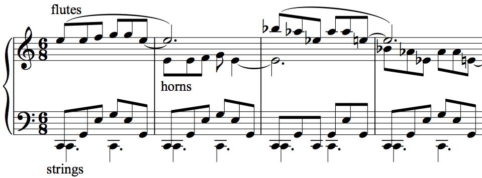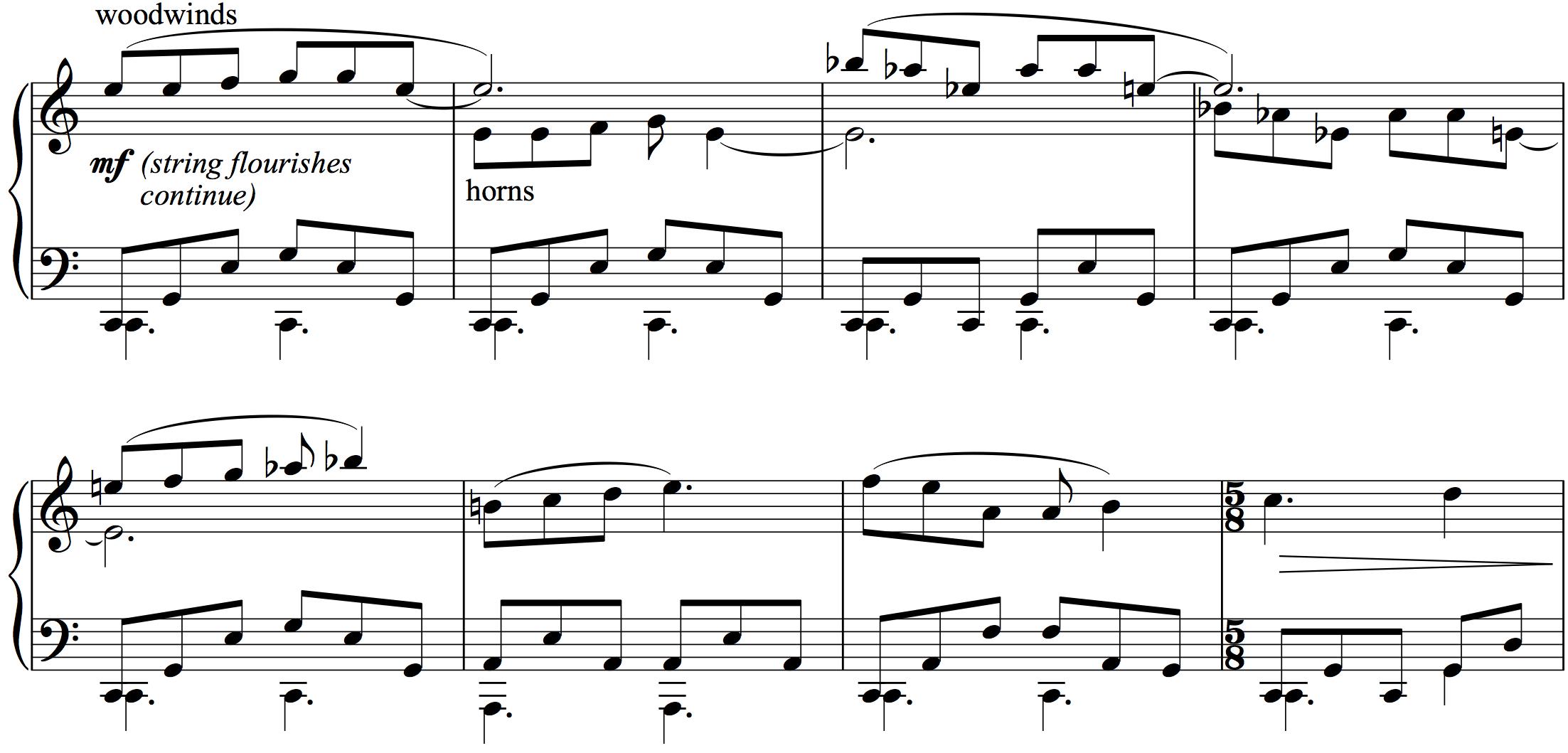 The second statement occurs just before David playfully blocks Monica’s way in an attempt to initiate a game with her. The accompanying string C major triad figures return, but the theme is now featured in flutes with a repeated response in horns (Figure 5), removing the “Curiosity” theme interruption. The “Bonding” theme has now nearly rid itself of the mecha elements, the electronics and the bitonality of the “Curiosity” theme, although the B♭, A♭, and E♭ still occur in the theme itself, perhaps suggesting the “artificiality” never fully disappears.