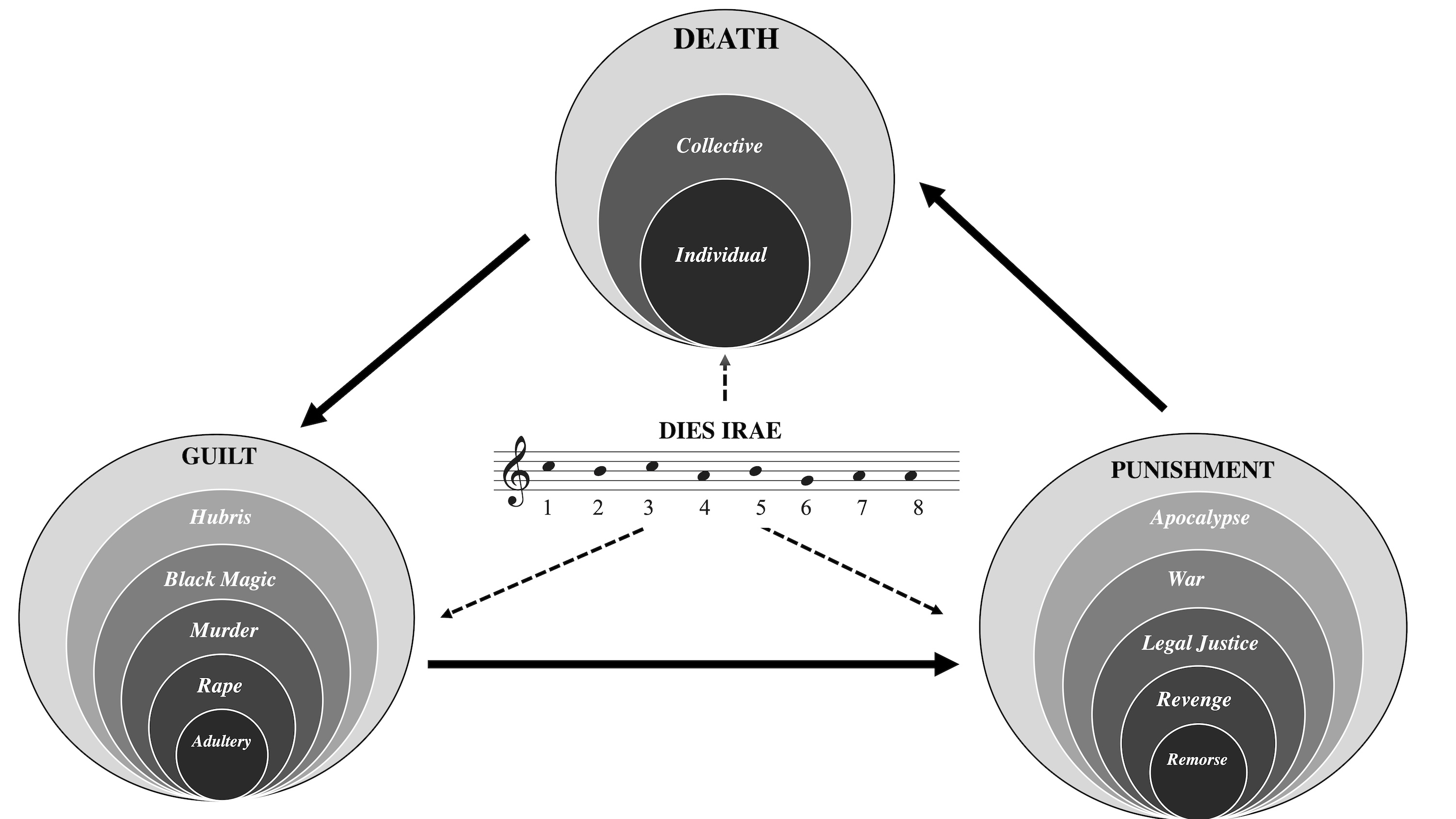 To listeners familiar with this text, the melodic line of the Dies irae - even in purely instrumental settings—has the potential to suggest at least three interconnected concepts: DEATH, GUILT, and PUNISHMENT (Figure 11). Each of these general concepts is instantiated by specific manifestations. DEATH encompasses both individual and collective demise; GUILT is exemplified by moral transgressions including adultery, rape, murder, black magic, and hubris; while PUNISHMENT can range from the emotional torment of private remorse to extrajudicial revenge, state-sanctioned legal retribution, the deprivations of war, and apocalypse. To what extent the meaning of a piece of film music that appears to allude to the Dies irae can be plausibly associated with any of these terms depends, again, on the context provided by the specific dramatic situation it accompanies.