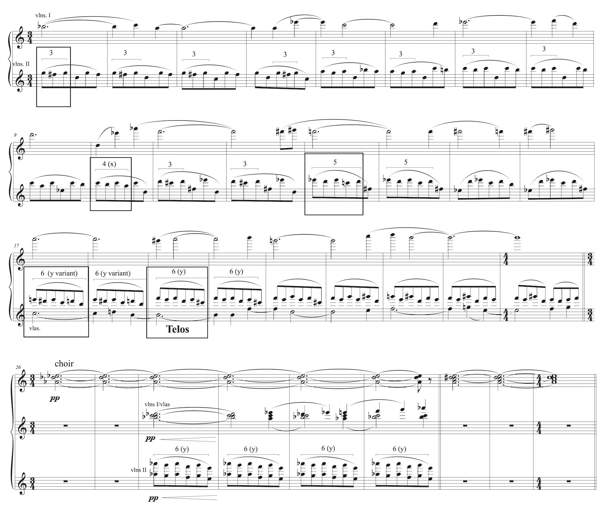 The music for the parallel scene at the beginning of Act III is constructed from similar elements, namely, motifs x and z of the Dies irae, but now the monochromatic timbre of string orchestra is replaced by the monochromatic timbre of a cappella chorus (Figure 33; Clip 38). The wordless, unaccompanied human voice is, of course, a hauntingly ironic choice of timbre for a post-apocalyptic world in which nothing remains of humanity but a few crumbling skyscrapers and two frozen robots. In this requiem for our now extinct species, the fire and ashes of the Day of Wrath have cooled into an icy serenity.