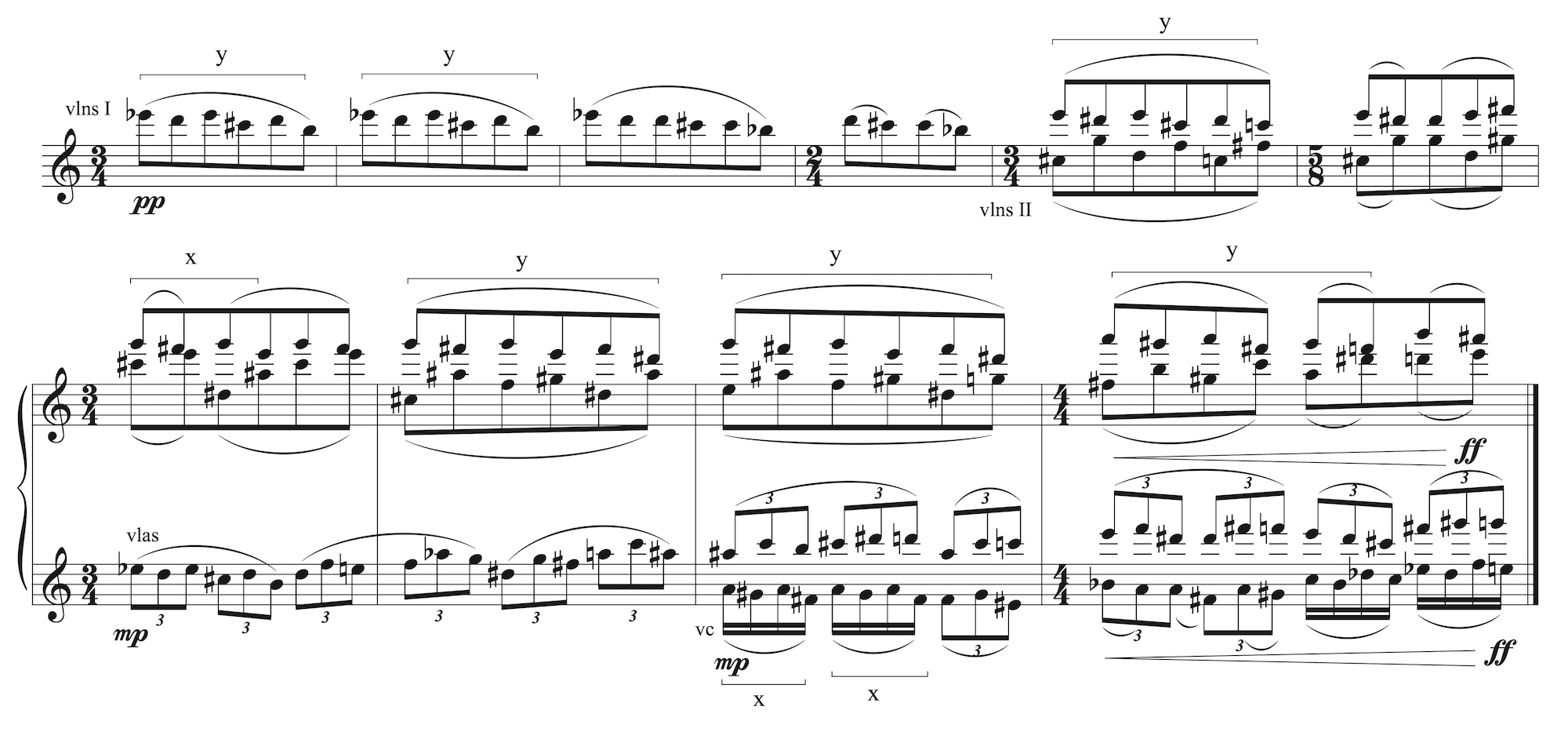 The visual symmetry is emphasized by the music for the two scenes, which incorporates motifs x and z of the Dies irae. The first cue, a ruminative elegy for strings that presents yet another manifestation of the Apocalypse trope, is shot through with subtle allusions to the Dies irae that will only come to fruition in Act III (Figure 32; Clip 37).23 The music enters near the end of the preceding scene, in which Professor Hobby ponders the obligations humans have to their mechanical children by comparing robots to Adam and humans to God (yet another instance of the arrogance that will ultimately destroy humanity). The references to the Dies irae in the music that follows serve as an ominous, prophetic commentary on Hobby’s hubris: as humans have replaced God, the music seems to suggest, so one day robots will replace humans.24