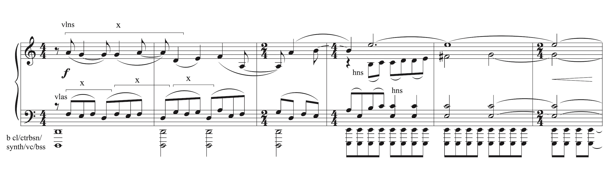 The reunion scene begins as Ray carries Rachel through an autumnal Boston street. As they approach the family home, a solo horn intones an elegiac melody that combines motifs x and x’ from “Woods Walk” into a Type 4 Dies irae which serves as the antecedent of a somber but serene period in the Dorian mode (Figure 28; Clip 34). The emergence of this extended theme in a score which until now has been almost entirely textural presents a major structural moment, as does the harmonic transition to diatonicism from the dense chromatic dissonance that dominates the rest of the score. The fact that the reunion theme’s bittersweet lyricism springs from the same motivic source as the music for the horrors of the river scene and the desolation of the refugees in “Woods Walk” poignantly expresses Ray’s character arc. Suffering has taught Ray to be a better person; only through confronting death and deprivation is he able to progress from deadbeat dad to paternal protector. By weaving the Dies irae into the music for the climactic reunion, Williams points to the root cause of Ray’s personal transformation, while simultaneously acknowledging the collective catastrophe that has befallen humankind.