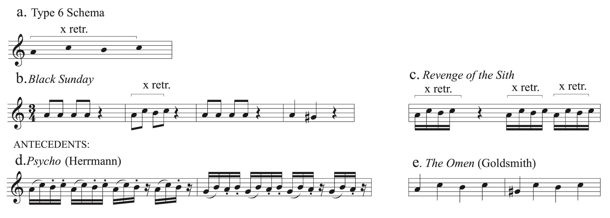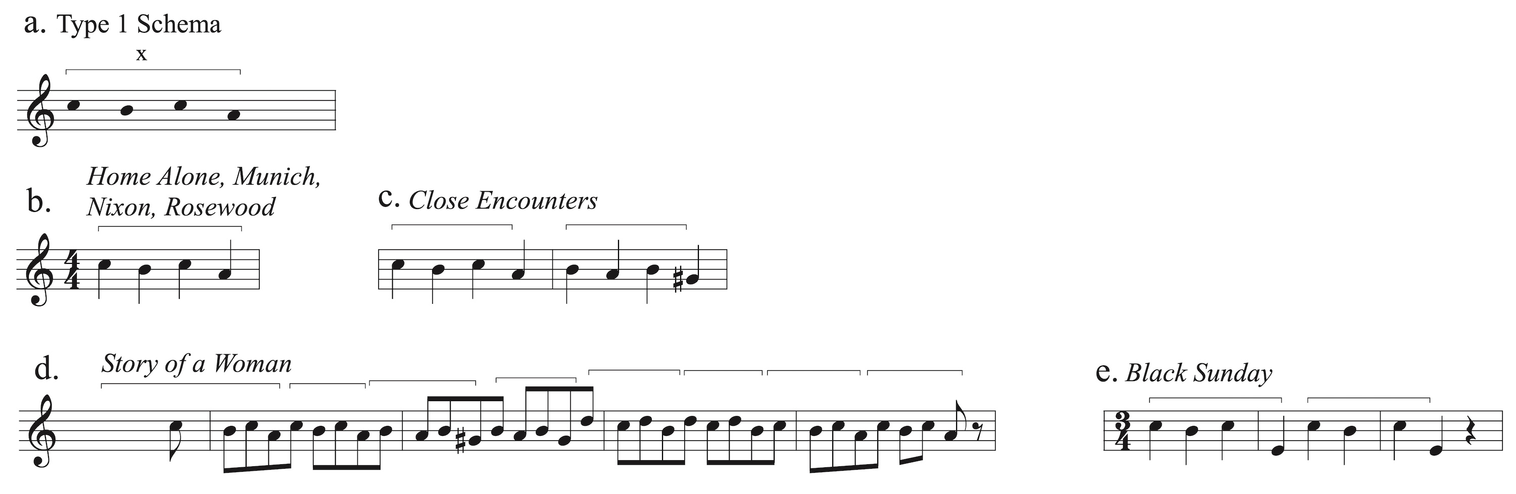 Williams uses these three motivic derivatives separately or in combination to create at least seven distinct variants or “types” of the chant melody.7 Type 1 consists of motif x—that is, the first four notes of the Dies irae. This is by far the most commonly used manifestation of the chant in Williams’s work (Figure 3b; Clip 4). Type 1 can be extended through sequential transposition, as in Close Encounters, or through repetition and transposition, as in Story of a Woman (Leonardo Bercovici, 1970) (Figures 3c and d). Note that it is common for Williams to substitute a lower pitch for the last note of the pattern, as in Black Sunday (John Frankenheimer, 1977, Figure 3e).
