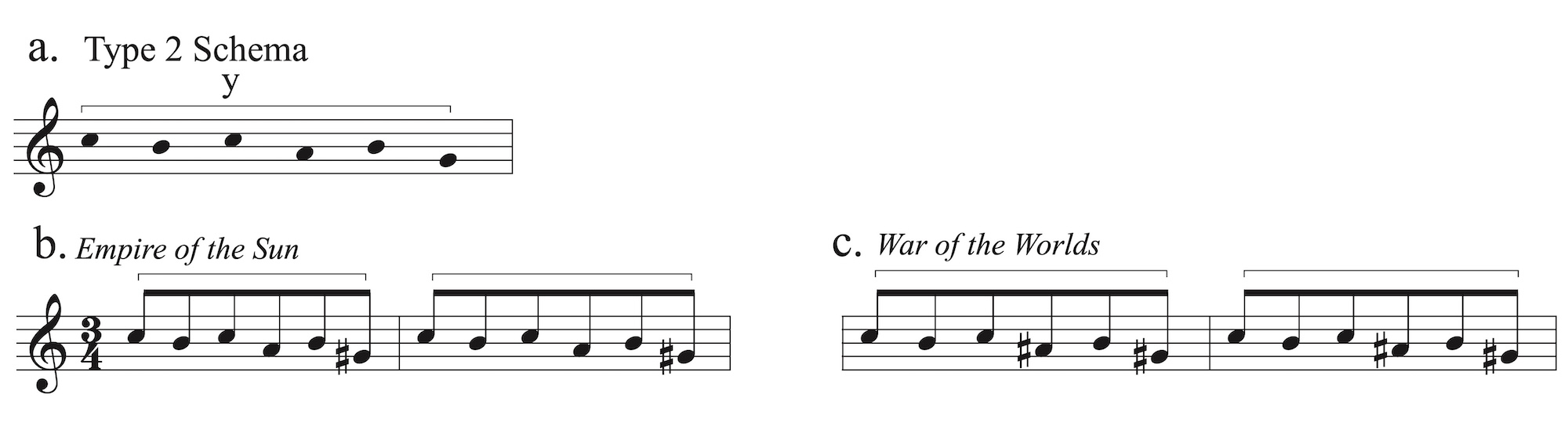 Type 2 consists of the first six notes of the Dies irae. Instead of the modal subtonic of the original, Williams typically raises the seventh scale degree, as in Empire of the Sun (1987)—a harmonic inflection that allows the motif to be smoothly integrated into octatonic or harmonic minor pitch fields (Figure 4b; Clip 5). Other pitches can also be inflected chromatically, as in War of the Worlds (2005), in which the outline of the Dies irae, in accommodation to the predominantly atonal harmonic idiom of the score, is compressed into the intervallic space of a chromatic cluster (Figure 4c).