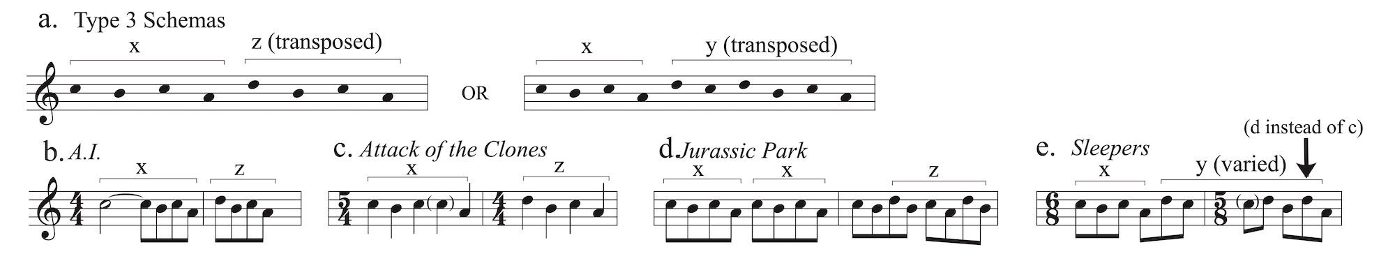 Type 3 combines motif x and the descending thirds of motif z, transposed up a step to start on scale degree 4 instead of 3. This variant appears, for example, in “The Journey Through the Ice” from A.I. Artificial Intelligence (Steven Spielberg, 2001, Figure 5b; Clip 6). Type 3 can be varied through interpolation of repeated notes, as in Star Wars: Episode II – Attack of the Clones (George Lucas, 2002, Figure 5c) or extended through repetition of segment x, as in Jurassic Park (Steven Spielberg, 1993, Figure 5d). A more complex variant of Type 3 appears in Sleepers (Barry Levinson, 1996, Figure 5e).