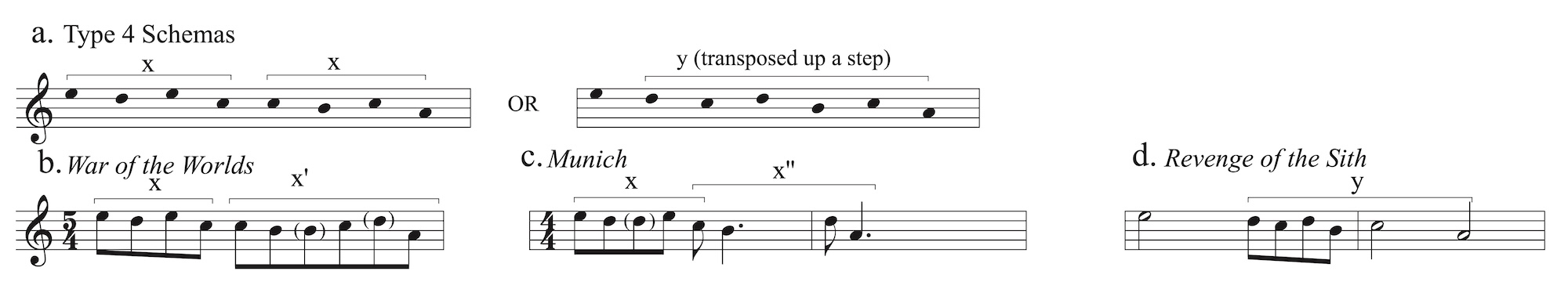 Type 4 starts on scale degree 5 and descends to the tonic by way of one or two statements of either x or y. This variant appears in War of the Worlds and Munich; here, both segments of the phrase present motif x, starting on scale degree 5, then transposed down a third. In the second segment, the schema is embellished through the repetition and interpolation of single pitches (Figures 6b and c; Clip 7). A variant of the schema can be observed in “Anakin’s Betrayal” from Star Wars: Episode III – Revenge of the Sith (George Lucas, 2005), which makes its way down to the tonic by way of motif y (Figure 6d).