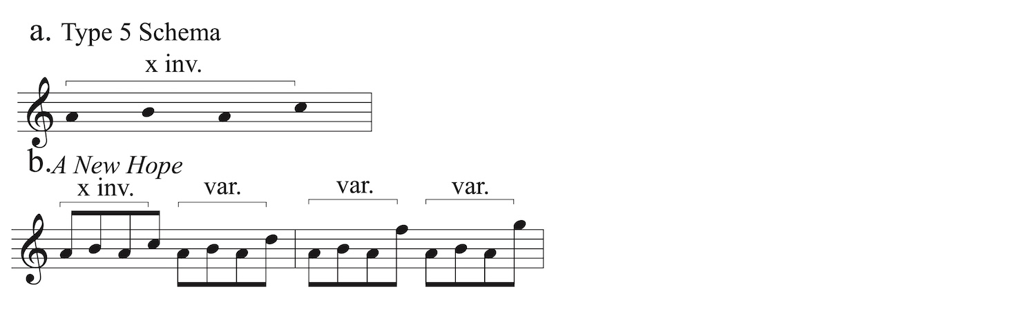 Types 5 through 7 can be heard as distant, but nonetheless audible, derivatives of the Dies irae (provided, of course, that the musical and dramatic context justifies such a reading). Type 5 consists of the inversion of the four-note head motif x (Figure 7a; Clip 8). This can be extended and varied through repetition of the first three pitches and ascending stepwise transposition of the last pitch, as is the case in the “Burning Homestead” cue from Star Wars: A New Hope (Figure 7b), in which the inversion of motif x serves as a build-up to a climax based on its original form (see Figures 1 and 18).