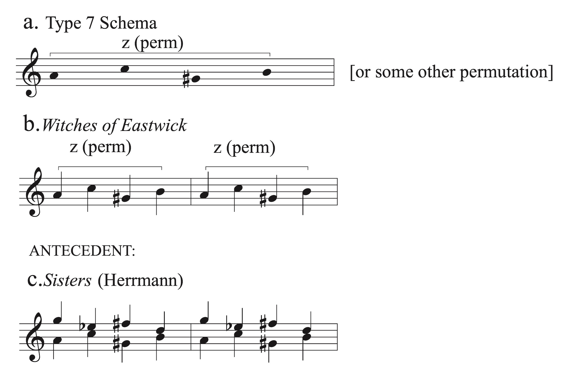 Finally, Type 7 presents a reordering of the adjacent thirds of motif z so they form ascending rather than descending thirds.8 This variant of the Dies irae is employed in The Witches of Eastwick (1987), where it is associated with the devil (Figure 9b; Clip 10). Like Type 6, Type 7 has antecedents in horror film scoring, particularly in Bernard Herrmann’s music for Sisters (1972, Figure 9c), which combines motif z in the top line with Type 7 in the counterpoint.