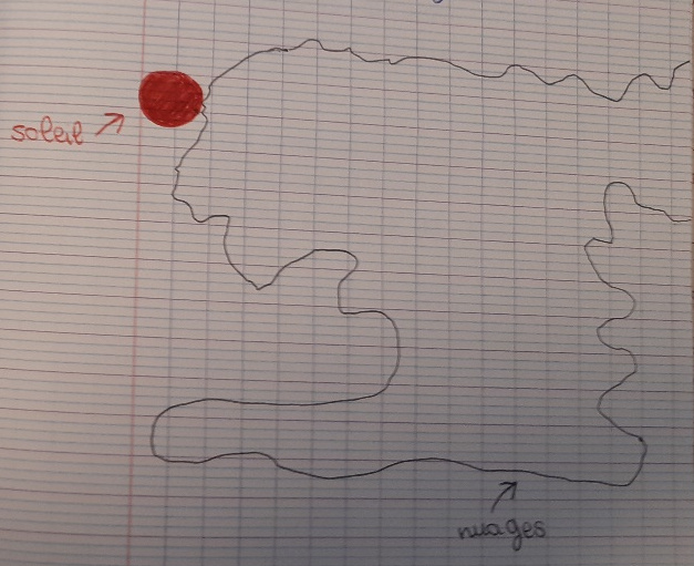 L’élève représente une forme faite de méandres (il est indiqué nuage en toutes lettres avec une flèche) et à gauche, un soleil rouge en dehors de la forme.
