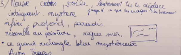 Regarder le ciel à l’extérieur va dans le sens d’une expérience poétique phénoménologique où le sujet est dans un être au monde immédiat, propice à l’expression poétique ensuite. Pendant une heure complète de cours, l’élève n’a d’autre consigne que l’observation du ciel, donnée à vivre dans un temps long. L’enseignant est là pour relancer l’attention : « Le bleu est-il toujours le même partout ? », « Quelles formes vois-tu ? », « À quoi cela te fait-il penser ? », « Que ressens-tu face au ciel ? » ou « Quelles sensations éprouves-tu ? » Cette attention au bleu est aussi favorisée par le brainstorming qui pousse à donner vie au bleu par un questionnement sur les sensations : « Si le bleu était un objet, quelles sensations auriez-vous à son contact ? (Quel goût ? Quelle sensation à son toucher ? Quelle odeur ? Quelle forme ? Quel son / musique ?) » L’élève est amené à imaginer le type de contact sensible qu’il aurait avec le bleu. Il doit se mettre à l’écoute de soi dans un temps vécu intensément. Dans quelle mesure ces outils ont-ils permis de développer cette attitude poétique de présence au monde, entendue comme écoute de l’immédiateté sensible ?