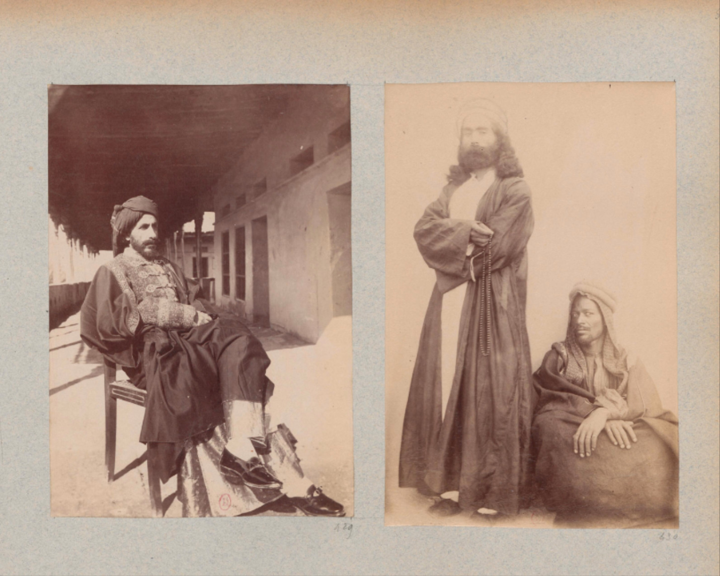 Dans les photographies prises par Dieulafoy lors des fouilles, on aperçoit parfois des groupes de travailleurs affairés ou des silhouettes indistinctes postées près des structures en pierre ; leur individualité est effacée par la distance, leur présence servant uniquement à indiquer l’échelle du tumulus. À côté de ces clichés lointains, on trouve également des images représentant des membres plus dynamiques de la population indigène ; riches en détails, ces images d’individus vêtus de tenues plus légères – parés de turbans ou d’anneaux de nez – font l’objet de mises en scène théâtrales, incarnant un autre registre de stéréotypes orientalistes (fig. 4).