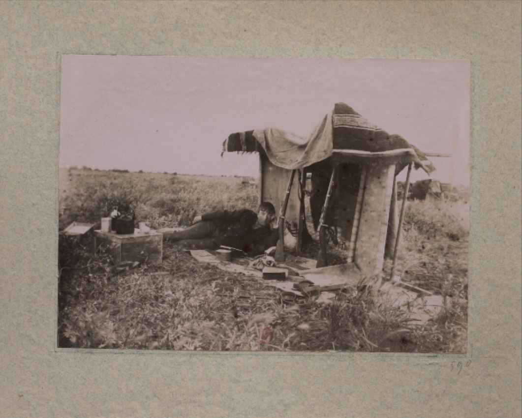Sur cette photographie, Jane Dieulafoy adopte une pose des plus saisissantes, allongé·e sur le côté, la tête appuyée sur la main et le visage recouvert de poussière (fig. 9). À ses côtés se trouve un abri modeste : une planche, une tapisserie, quelques bouts de bambou qui maintiennent l’ensemble en place. Deux larges fusils en encadrent l’entrée. Dieulafoy se trouve à proximité de ces armes, ce qui tend à montrer que l’orientaliste n’a pas besoin d’être protégé·e, bien au contraire. Devant Dieulafoy, un livre est appuyé contre une boîte en étain et d’autres livres, ainsi que divers équipements, l’entourent, symboles de la vie domestique. Le fait que Dieulafoy adopte presque une posture d’odalisque dans cette image suggère également une myriade d’associations visuelles : peut-être l’aisance languissante des Femmes d’Alger dans leur appartement de Delacroix (1833), de la Grande Odalisque nue d’Ingres (1814), ou de l’Odalisque de Renoir (1870). Toutes ces associations un peu lascives rappellent que Dieulafoy se trouve au pays des sérails. Iel est loin, pourtant, d’être une odalisque : son corps est entièrement revêtu d’un pantalon en laine et d’une veste boutonnée qui épousent confortablement ses formes, sans pour autant suggérer la moindre disponibilité sexuelle. Peut-être ces couches de vêtements participent-elles pleinement à la plaisanterie suggérée par cette pose. Ce qui est illicite ici n’est pas l’évocation d’un corps féminin trop visible, mais bien son effacement. Dans ce détournement du thème visuel de la nudité féminine, les vêtements de Dieulafoy peuvent aussi évoquer Le Déjeuner sur l’herbe de Manet (1863) et sa mise en scène radicale d’une division vestimentaire genrée. Dans ce tableau, une femme nue regarde le spectateur tandis que deux hommes à ses côtés – dont l’un adopte une posture similaire à celle de Dieulafoy – discutent. Ainsi, à qui peut-on comparer Jane sur la photographie ? À la femme nue ou à l’homme trop habillé pour l’occasion ? Ou bien se pourrait-il que la fameuse courtisane de Manet, cette Olympia qui fixe le spectateur sans peur et sans complexe, soit la référence visuelle la plus adaptée à ce portrait ? Quelle que soit l’intention précise de Dieulafoy, une telle photographie renvoie à un champ prolifique de références visuelles et représente encore, pour ce xixe siècle finissant, une forme de provocation.