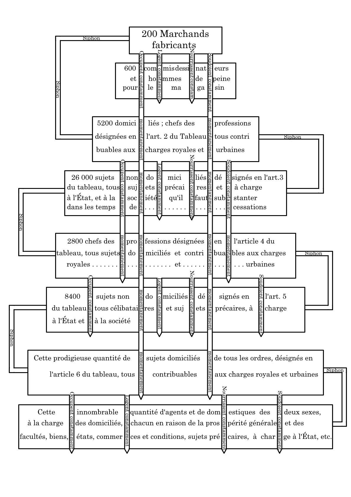 Chaque rectangle représente ici une « classe » dans l’ordre corporatif et la division du travail de la manufacture lyonnaise : les « 200 marchands-fabricants », les « 5 200 » maîtres-ouvriers ou l’« innombrable quantité d’agents » qui occupent ce qu’on appellerait aujourd’hui des emplois indirects. L’ordre dans lequel les acteurs apparaissent, de haut en bas, est déterminé par leur rôle dans l’émission et redistribution des flux qui font le système productif, représentés par les flèches verticales qui partent de ou traversent chaque rectangle. Au sommet : les marchands dont les avances servent à « occuper, loger, nourrir, soudoyer » totalement ou partiellement tous les autres. Plus bas, les maîtres-ouvriers, salariés des marchands, qui entretiennent à leur tour « 26 000 sujets » de leurs employés, dont la consommation entretient ensuite, indirectement, une « prodigieuse quantité » de détaillants – bouchers, boulangers, tailleurs, etc. Dans cette chaîne, deux catégories de flux, reliant deux sortes d’agents sont distinguées. Certains liens se maintiennent « constamment » : ils figurent les transferts monétaires et en nature réalisés au sein de l’unité productive familiale, unissant les chefs « domiciliés », « contribuables aux charges royales et urbaines », à leurs employés « précaires ». Ils servent à satisfaire les besoins vitaux des individus, d’où leur permanence. D’autres transferts n’opèrent que « temporairement » : ils représentent les salaires ou façons, reliant les « chefs » entre eux, et sont indexés sur le débit des étoffes lyonnaises, potentiellement taris par la conjoncture ou les stratégies des marchands, d’où leur caractère temporaire. Or, comme l’exprime chaque flèche, un même transfert est à la fois ultimement déterminé par les aléas commerciaux et employé aux dépenses de consommation. La surdétermination des flux par les individus s’adonnant à la spéculation commerciale nuit alors au système social et à la richesse nationale. C’est ce que signale le « siphon », qui n’est pas un flux, sinon en négatif : l’idée qu’une poignée d’acteurs peut obérer la capacité de consommation de toute une grande ville. Une seule solution s’imposerait – et elle n’est pas neuve – : supprimer le monopole marchand sur les fonctions commerciales, afin que tous les chefs d’atelier puissent avoir directement accès à l’argent de la classe des propriétaires. Ils ne le renverraient que mieux vers la classe productive…